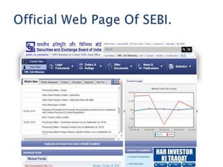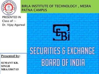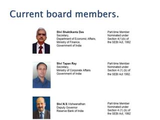 SEBI was constituted in 1988 as a non-statutory body and was given statutory powers in 1992 through the SEBI Act. It acts as the regulator for the securities market in India and aims to protect investors and ensure the orderly and fair development of securities markets. SEBI has regulatory and developmental functions like registering market intermediaries, prohibiting unfair trade practices, promoting investor education and conducting research. It oversees stock exchanges, collects fees and charges, and has powers to regulate market participants and activities.