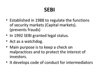 SEBI (Securities and Exchange Board of India) was established in 1988 to regulate securities markets in India and protect investors. It was granted legal status in 1992. SEBI acts as a watchdog to prevent market manipulation like price rigging and insider trading. It has protective, developmental, and regulatory functions. Its protective functions include checking price rigging and unfair trade practices. Its regulatory functions include framing rules, registering intermediaries like brokers, and inspecting stock exchanges.
