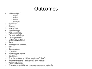 The document provides a comprehensive overview of seborrheic dermatitis, detailing its definition, etiology, risk factors, epidemiology, pathophysiology, and management guidelines. It highlights the condition's clinical symptoms and signs, especially its effects on sebaceous-gland-rich areas of the skin, while offering insight into common treatments and their complications. The document also includes differential diagnoses and emphasizes the importance of patient education and follow-up care.