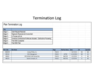 The document is a termination checklist and related documents from a retirement plan administrator to a plan sponsor terminating their retirement plan. It provides instructions on executing a plan termination, including passing a resolution, notifying participants, distributing assets according to guidelines, and paying applicable fees. The plan sponsor must complete and return the forms to the administrator to authorize an informal plan termination.
