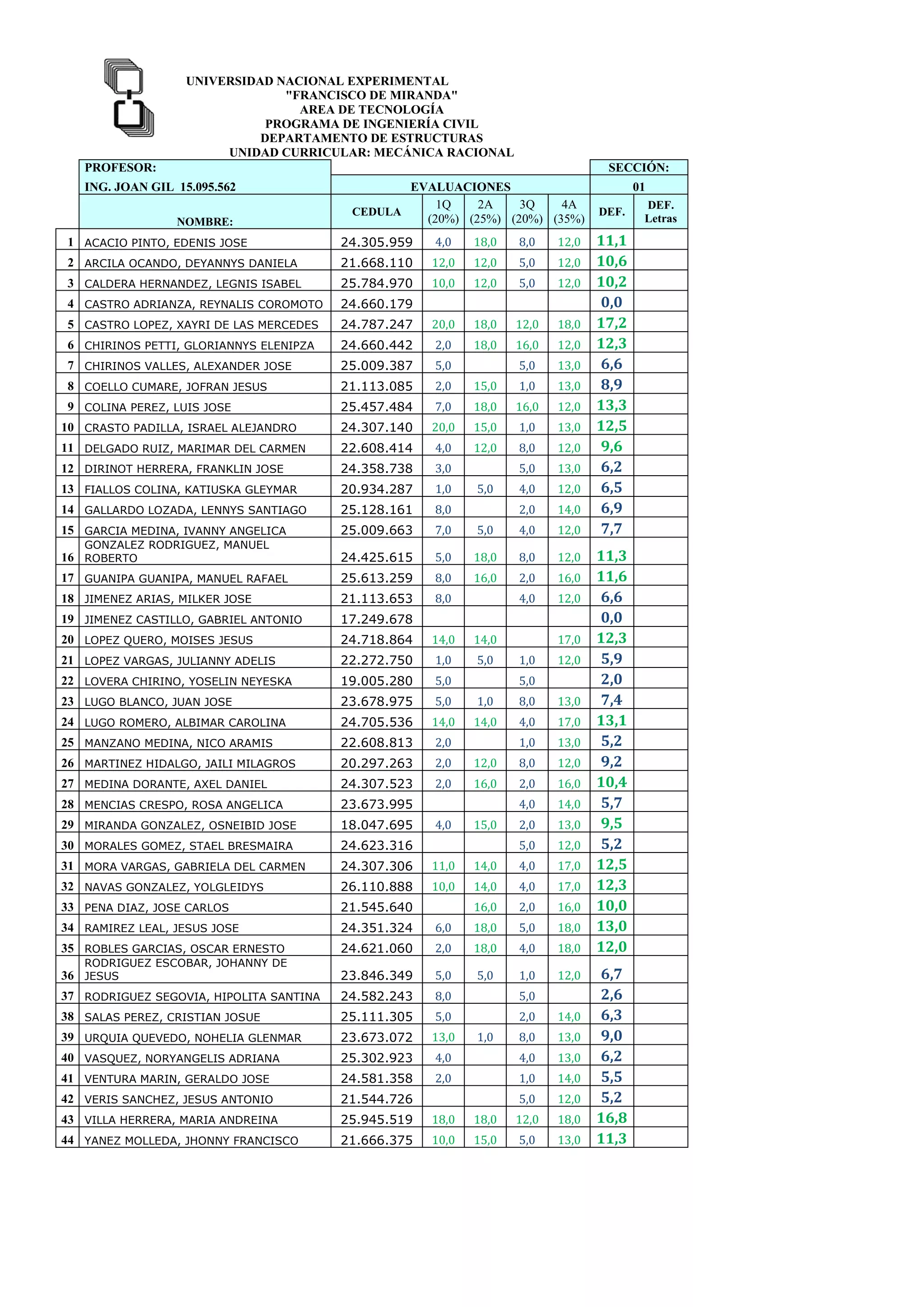 This document contains a table listing 44 students' grades in 4 evaluations for the Mechanics course taught by Professor Joan Gil. It includes each student's name, identification number, and their grades on the 1st evaluation (20%), 2nd evaluation (25%), 3rd evaluation (20%), 4th evaluation (35%), and their final letter grade. The highest scoring student was Maria Andreina Villa Herrera with grades of 18, 18, 12, and 18 for a final score of 16.8.