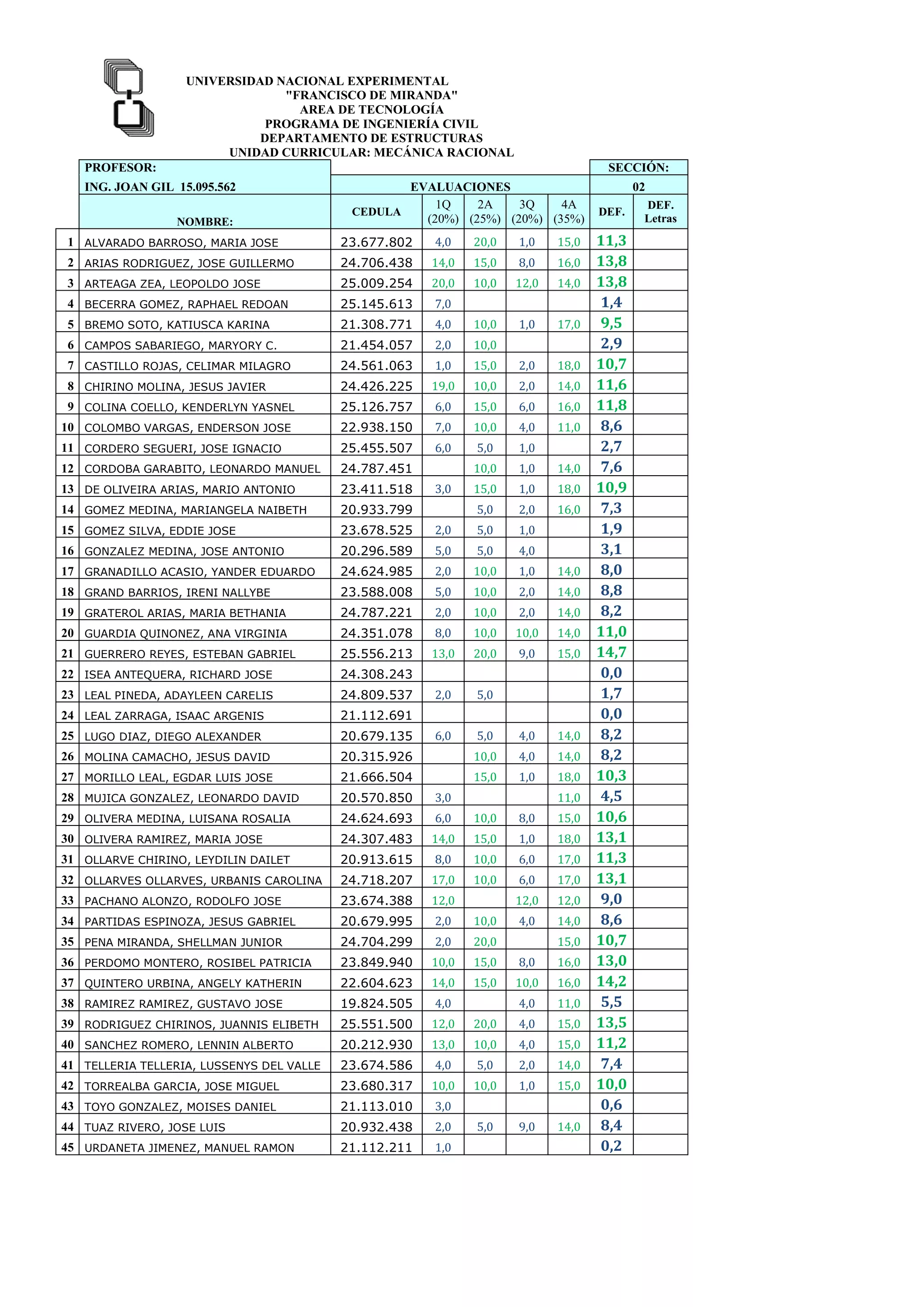 This document appears to be a report listing grades for 45 students in a Mechanics course taught by Professor Joan Gil. It includes each student's name, identification number, grades for four assessments (worth 20%, 25%, 20%, and 35% respectively), final grade, and whether they passed or failed. The highest grade was earned by student #21 Guerrero Reyes, Esteban Gabriel with a final grade of 14.7. Grades ranged from 0.2 to 20 with most students earning final grades between 8-14.