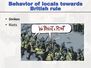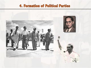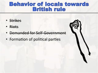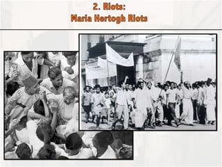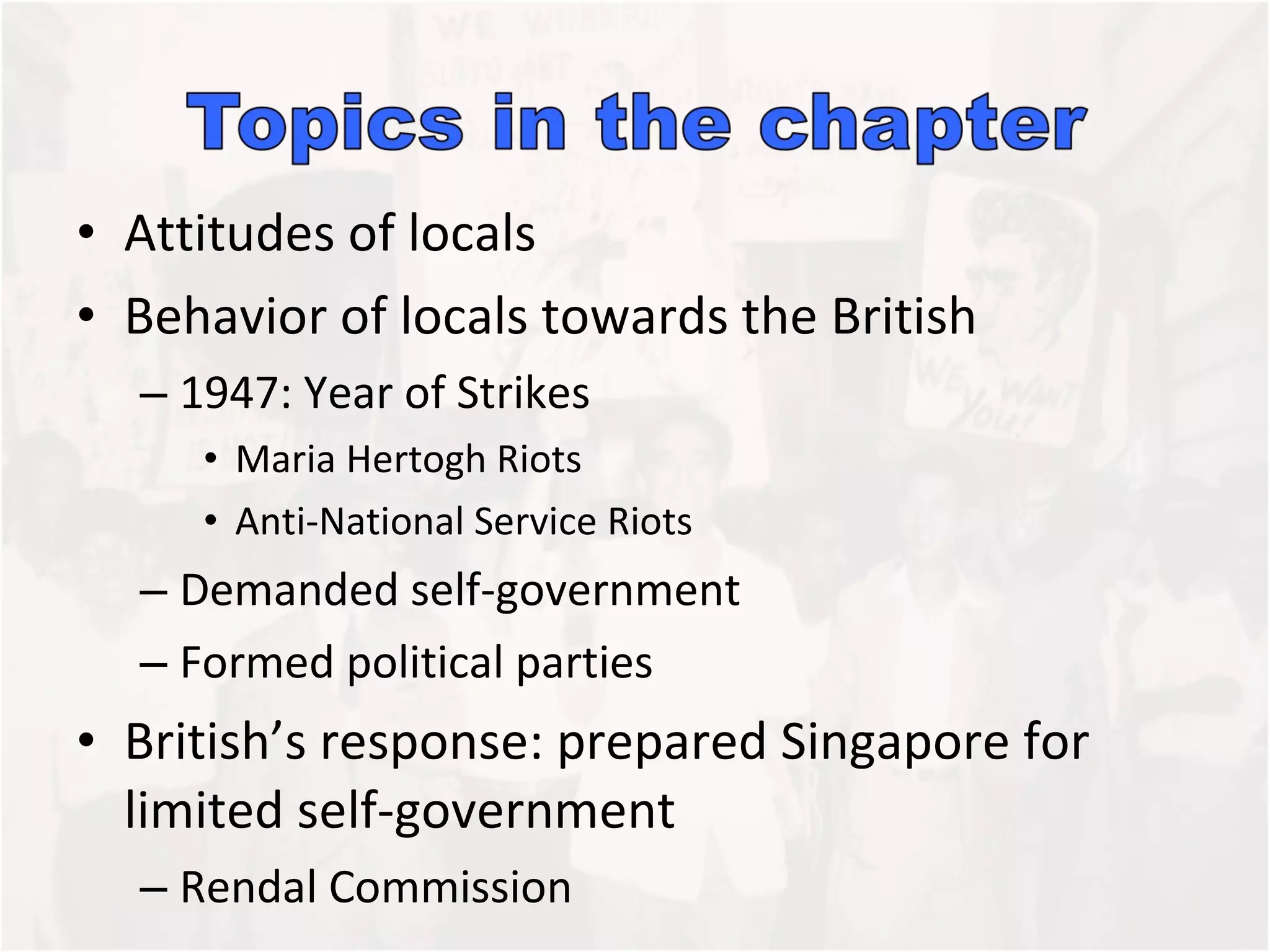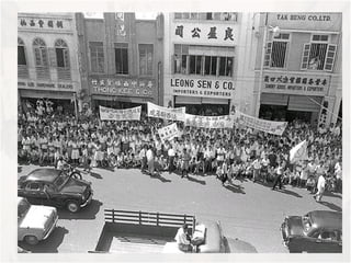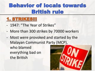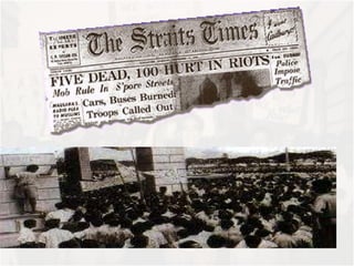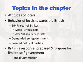 The document discusses Singapore's path towards self-government and independence from British rule between 1947-1955. It describes the attitudes of locals towards the British, including riots in 1947 and 1950 that expressed unhappiness with British governance. Political parties like the Singapore Progressive Party and People's Action Party were formed to advocate for self-government and an end to colonial rule. The British responded by establishing the Rendel Commission and introducing limited self-government through the 1955 Rendel Constitution, transferring some powers to elected local leaders and political parties. However, full independence was still being introduced gradually.