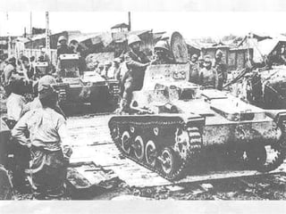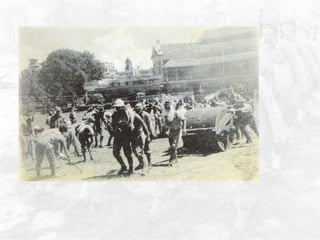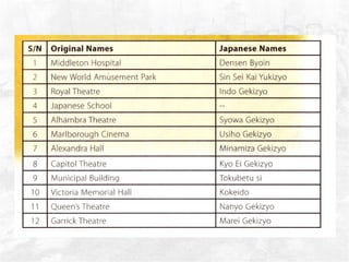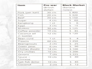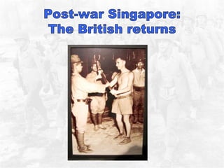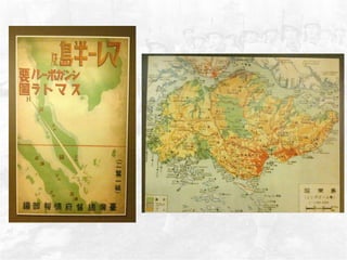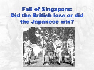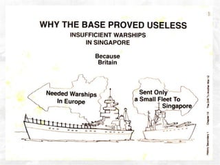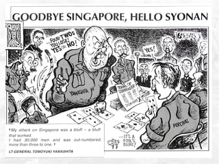 The document summarizes the British defense of Singapore and the reasons for its fall to the Japanese in 1942. It discusses the British strategy of using Singapore as a naval base protected by coastal guns. However, the British were unprepared for jungle warfare and lacked tanks and aircraft. In contrast, the Japanese were well-trained and equipped for jungle combat. The document also outlines the political, economic, and social impacts of Japanese occupation, including rationing, inflation, and efforts to promote Japanese culture in Singapore.