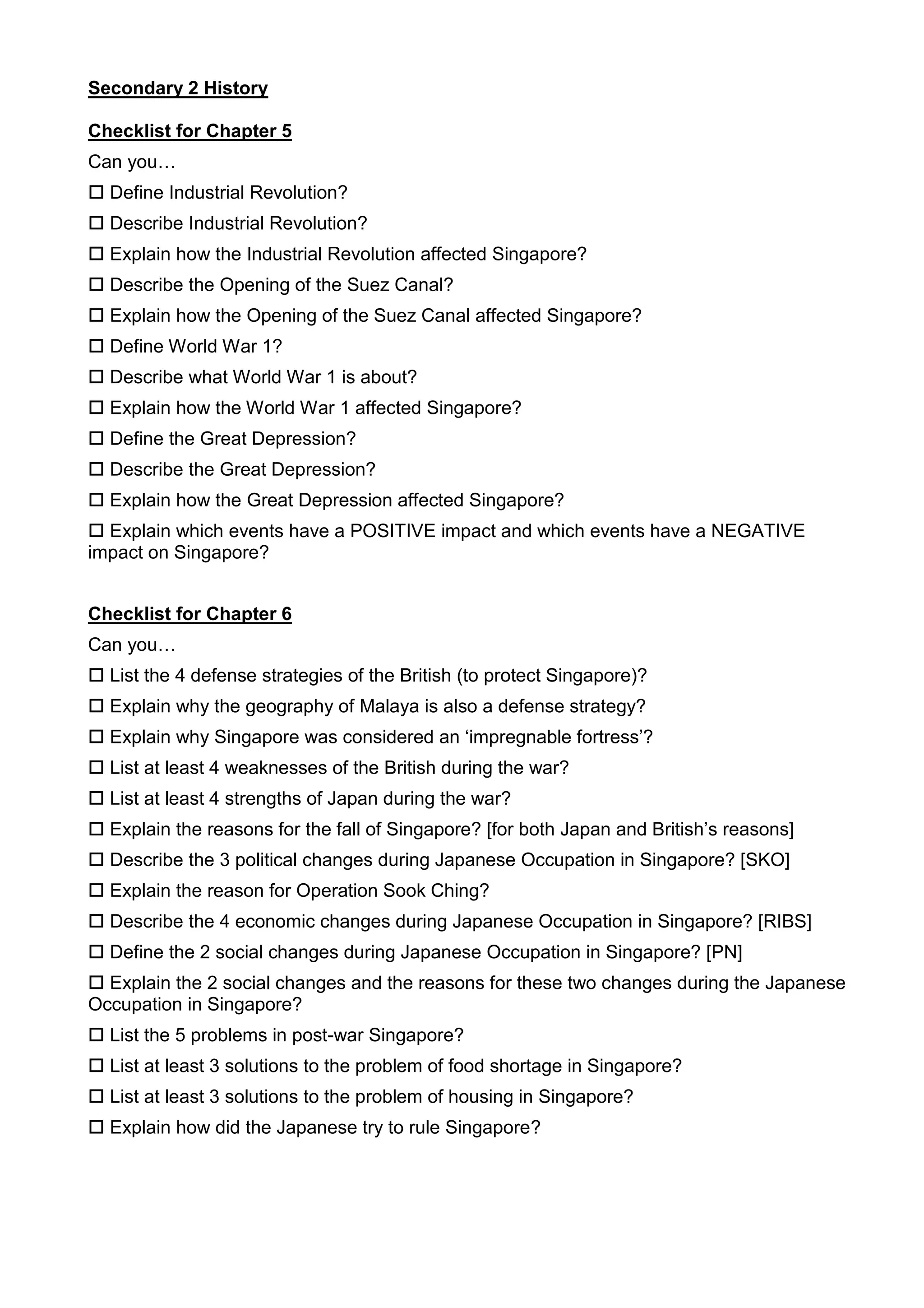 The document provides checklists of concepts and events from Singaporean history chapters 5-10 that a student should be able to define, describe, explain or list. It covers topics like the Industrial Revolution, World Wars 1 and 2, the Japanese Occupation, Singapore's self-government and independence, merger with and separation from Malaysia, and Singapore's social and economic development in its early years.