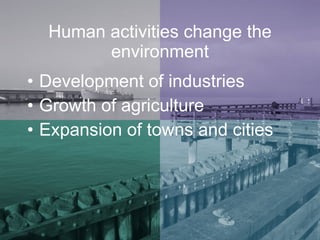 Human activities such as the development of industries, growth of agriculture, and expansion of towns and cities have changed the environment by increasing pollution and consumption of resources. Population growth and technological advancement have also contributed to environmental changes. Sustainable practices are needed to manage the environment and address the impacts of human activities and development.