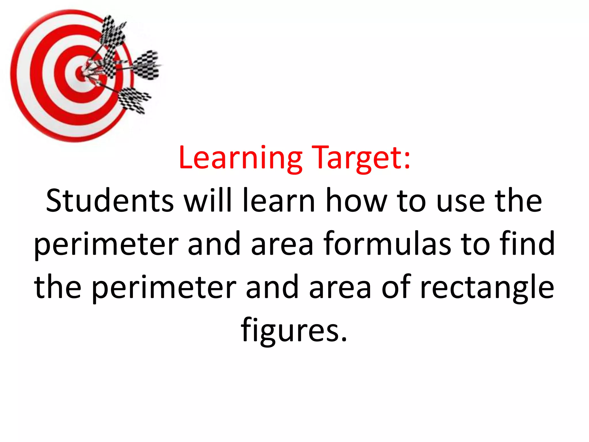 Students will learn how to use the perimeter and area formulas to find the perimeter and area of rectangle figures. The perimeter is the distance around the figure and is calculated by 2 times the length plus 2 times the width. The area is the amount of surface the figure covers and is calculated by length times width. Examples are provided of calculating the perimeter and area of rectangles with given dimensions in meters, feet, and other units.