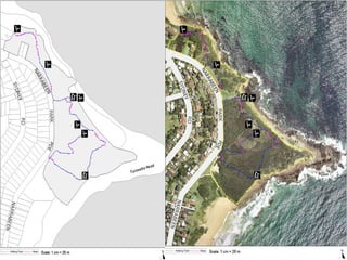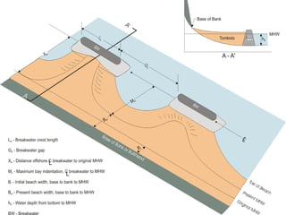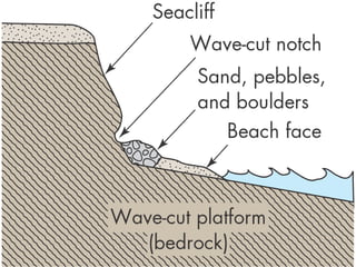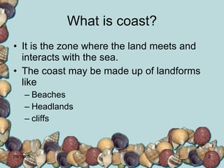 The document defines and describes coastal landforms and processes. It explains that the coast is where land meets the sea and can include beaches, headlands, and cliffs. It then outlines the main coastal processes of erosion, transportation, and deposition that are caused by wave action, tides, currents, and wind energy. These processes shape landforms like beaches, spits, tombolos, cliffs, shore platforms, bays, and areas affected by wave refraction.