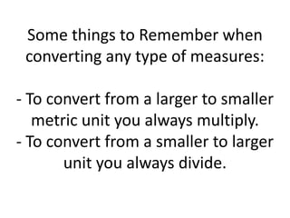 The document discusses converting between metric units of measurement by multiplying or dividing by powers of 10. It provides examples of converting grams to kilograms, milliliters to liters, and meters to kilometers. Students are expected to learn that multiplying converts to a smaller unit and dividing converts to a larger unit. Mnemonic devices are suggested to remember the order of metric units from smallest to largest.