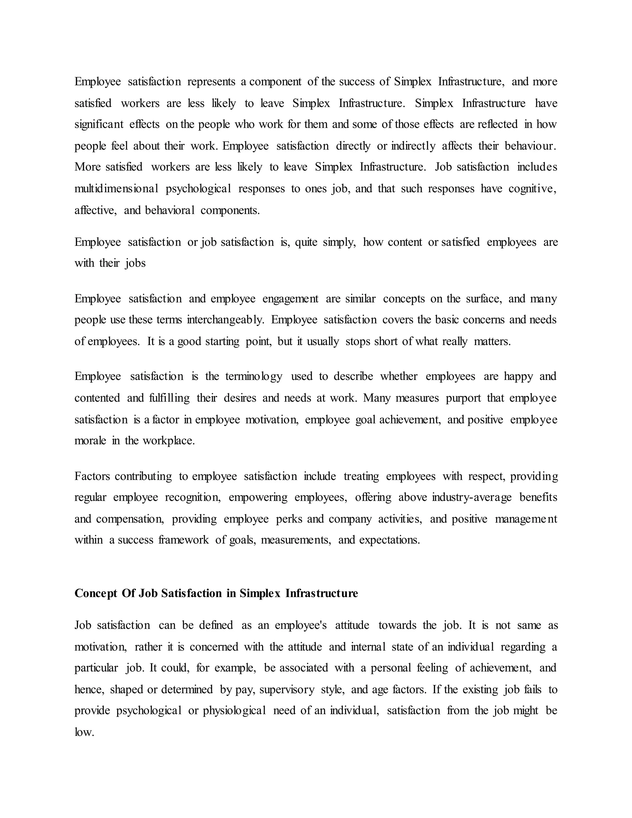 This document discusses factors that contribute to employee satisfaction at Simplex Infrastructure, including treating employees with respect, providing recognition, empowering employees, offering competitive benefits, and positive management. It also discusses how employee satisfaction can be measured through surveys and how Simplex Infrastructure aims to enhance job satisfaction through employee orientation, developing a positive work environment, tracking satisfaction, and recognizing employees.