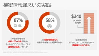 ...は宛先を間違えて 機密情報を送った経験がある1 58% ...の上級管理者は 会社のデータを個人の メールやクラウド サービスに 日常的に転送している1 87% 全業種含めた 平均的な 1