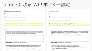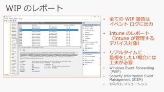 WhatsApp Power Point OneDrive PDF Reader Weather 企業用 アプリとデータ (管理対象) 個人用 アプリとデータ (管理対象外) データのやり取りが ブロックまたは監査される WIP 対応 アプリとデータ Calendar Photos eMail Contacts WIP 対応アプリ WIP 非対応アプリ 個人用アプリ 企業 個人 • データは暗号化されて保存される • データは分離される • データ交換はブロックまたは監査される • 企業用と定義された領域にアクセス可能 • データが企業用か個人用かを選択できる • 企業用と定義された領域にアクセス可能 • データは暗号化されずに保存される • 暗号化された (企業用) ファイルにアクセス不可 • 企業用と定義された領域にアクセス不可