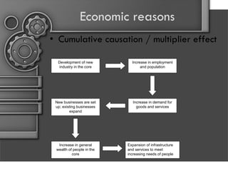 Uneven development exists for several economic, social, and political reasons. Economically, the development of new industries in core regions leads to multiplier effects of increased employment, wealth, and expansion of businesses and infrastructure. This causes a backwash effect that drains resources from peripheral regions. Socially, factors like lack of education funding from governments, high population growth rates, and internal conflicts negatively impact development. Politically, problems such as wars, instability, and lack of good leadership and governance prevent equal development across regions.