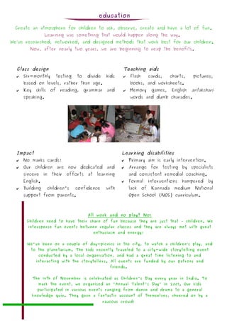 This document provides an overview of the Swagath Education and Community Action (SECA) organization, which aims to support education, health, and employment opportunities for children, families, and communities in South Bangalore. It discusses SECA's vision and programs, which include an English language program, extracurricular activities, health camps, computer training, and helping youth find employment. The document also previews SECA's plans to expand its educational scholarships, subject coaching classes, and health programs going forward.