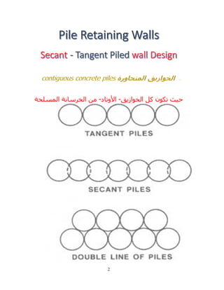 The document discusses various construction techniques involving concrete pile walls, specifically focusing on contiguous and secant piled walls for earth retention. It outlines the advantages of these methods, such as cost-effectiveness, low vibration during installation, and suitability for a variety of soil conditions. Additionally, it describes the construction process of secant piles, including the arrangement and mixing of concrete types to ensure structural integrity and minimize water ingress.