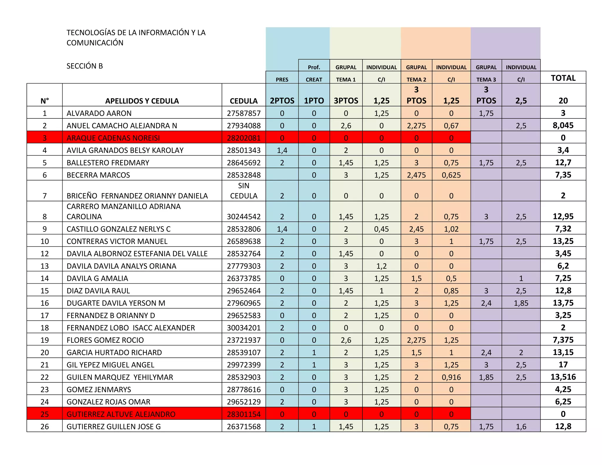 INFORMACIÓN Y LA COMUNICACIÓN SECCIÓN B Prof. GRUPAL INDIVIDUAL GRUPAL INDIVIDUAL GRUPAL INDIVIDUAL PRES CREAT TEMA 1 C/I TEMA 2 C/I TEMA 3 C/I TOTAL N° APELLIDOS Y CEDULA CEDULA 2PTOS 1PTO 3PTOS 1,25 3 PTOS 1,25 3 PTOS 2,5 20 1 ALVARADO AARON 27587857 0 0 0 1,25 0 0 1,75 3 2 ANUEL CAMACHO ALEJANDRA N 27934088 0 0 2,6 0 2,275 0,67 2,5 8,045 3 ARAQUE CADENAS NOREISI 28202081 0 0 0 0 0 0 0 4 AVILA GRANADOS BELSY KAROLAY 28501343 1,4 0 2 0 0 0 3,4 5 BALLESTERO FREDMARY 28645692 2 0 1,45 1,25 3 0,75 1,75 2,5 12,7 6 BECERRA MARCOS 28532848 0 3 1,25 2,475 0,625 7,35 7 BRICEÑO FERNANDEZ ORIANNY DANIELA SIN CEDULA 2 0 0 0 0 0 2 8 CARRERO MANZANILLO ADRIANA CAROLINA 30244542 2 0 1,45 1,25 2 0,75 3 2,5 12,95 9 CASTILLO GONZALEZ NERLYS C 28532806 1,4 0 2 0,45 2,45 1,02 7,32 10 CONTRERAS VICTOR MANUEL 26589638 2 0 3 0 3 1 1,75 2,5 13,25 12 DAVILA ALBORNOZ ESTEFANIA DEL VALLE 28532764 2 0 1,45 0 0 0 3,45 13 DAVILA DAVILA ANALYS ORIANA 27779303 2 0 3 1,2 0 0 6,2 14 DAVILA G AMALIA 26373785 0 0 3 1,25 1,5 0,5 1 7,25 15 DIAZ DAVILA RAUL 29652464 2 0 1,45 1 2 0,85 3 2,5 12,8 16 DUGARTE DAVILA YERSON M 27960965 2 0 2 1,25 3 1,25 2,4 1,85 13,75 17 FERNANDEZ B ORIANNY D 29652583 0 0 2 1,25 0 0 3,25 18 FERNANDEZ LOBO ISACC ALEXANDER 30034201 2 0 0 0 0 0 2 19 FLORES GOMEZ ROCIO 23721937 0 0 2,6 1,25 2,275 1,25 7,375 20 GARCIA HURTADO RICHARD 28539107 2 1 2 1,25 1,5 1 2,4 2 13,15 21 GIL YEPEZ MIGUEL ANGEL 29972399 2 1 3 1,25 3 1,25 3 2,5 17 22 GUILEN MARQUEZ YEHILYMAR 28532903 2 0 3 1,25 2 0,916 1,85 2,5 13,516 23 GOMEZ JENMARYS 28778616 0 0 3 1,25 0 0 4,25 24 GONZALEZ ROJAS OMAR 29652129 2 0 3 1,25 0 0 6,25 25 GUTIERREZ ALTUVE ALEJANDRO 28301154 0 0 0 0 0 0 0 26 GUTIERREZ GUILLEN JOSE G 26371568 2 1 1,45 1,25 3 0,75 1,75 1,6 12,8