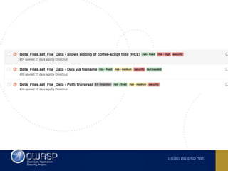 The document outlines the SecDevOps Risk Workflow, emphasizing the integration of application security (appsec) within development processes to manage risks effectively. It stresses the importance of aligning security practices with business goals, creating workflows using tools like Jira, and promoting a culture of security within development teams. Additionally, it advocates for direct involvement of developers in security measures, leveraging threat modeling, and ensuring timely issue management through clear paths of risk acceptance and resolution.