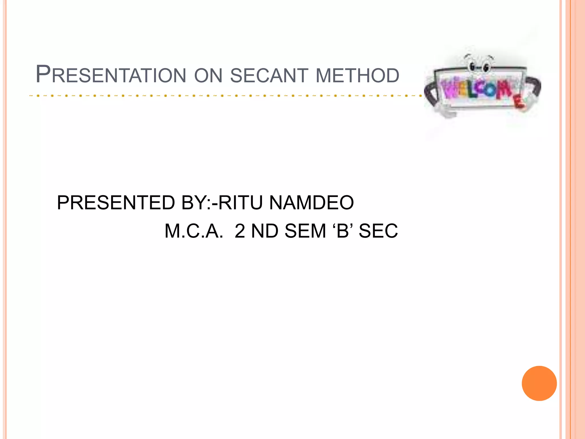 The secant method is a root-finding algorithm that uses successive secants of a function to linearly approximate the root. It requires two initial guesses, x0 and x1, to construct a secant line through the points (x0, f(x0)) and (x1, f(x1)). The x-intercept of this line provides the next approximation x2. Repeating this process iteratively refines the approximation until the root is found to within a desired precision. The secant method converges faster than bisection near roots and does not require evaluating derivatives, but it may fail to converge for some functions.