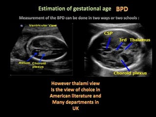 This document provides an overview of a lecture on second and third trimester emergencies during pregnancy. It discusses essential elements of an emergency ultrasound scan, including determining the fetal lie and position, measuring gestational age using BPD and femur length, locating the placenta, and assessing amniotic fluid levels. Potential emergencies that may occur during this time include preterm labor, placental issues, hemorrhage, and too much or too little amniotic fluid. The document outlines techniques for evaluating these elements in an emergency scan.