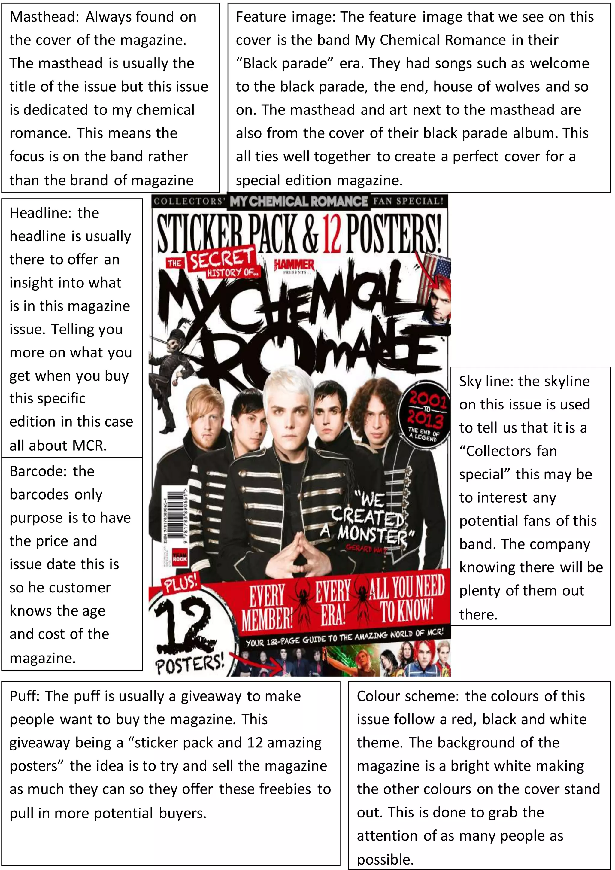 The document discusses the cover of a magazine dedicated to the band My Chemical Romance. The cover features an image of the band from their "Black Parade" era. Elements like the masthead, headline, and color scheme are designed to tie into the band's aesthetic and signal to fans that this is a special collector's issue focused on My Chemical Romance. The contents page continues this theme with a large central image of the band and text listing articles in neat columns at the bottom of the page to avoid clutter.
