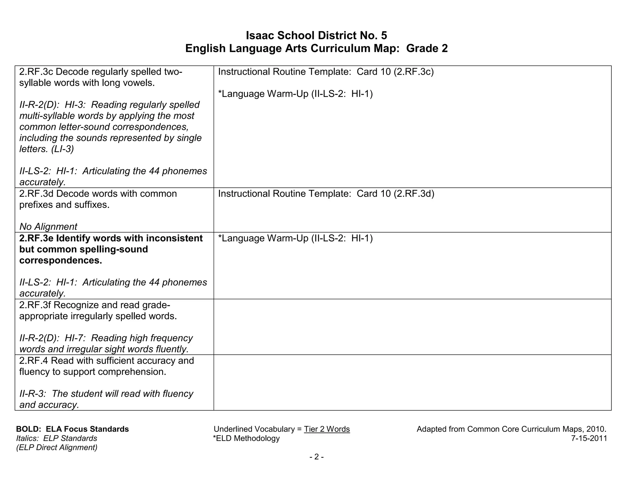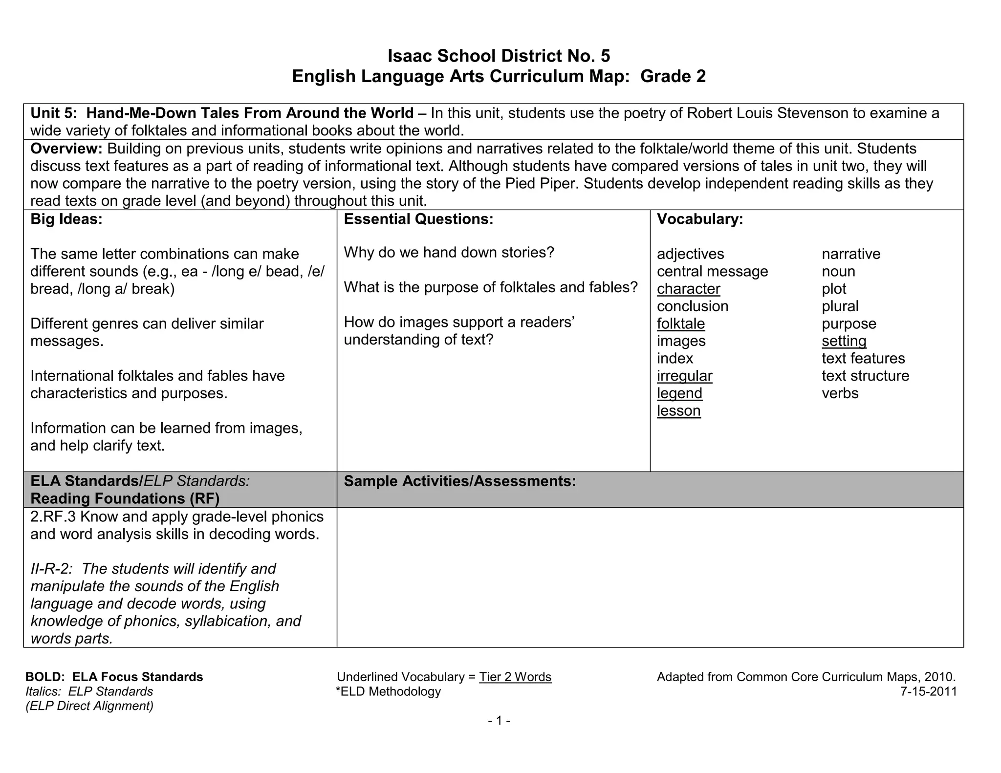 This document provides an English Language Arts curriculum map for grade 2 at the Isaac School District. The map outlines a unit on folktales from around the world, focusing on building students' writing, reading, speaking and listening skills through examining stories, poems, and informational texts. Key areas of study include comparing versions of tales, analyzing story elements and text features, and producing opinion pieces, narratives, and research projects connected to the folktale theme. Standards and sample activities are listed to develop students' language use, comprehension, and literacy.
