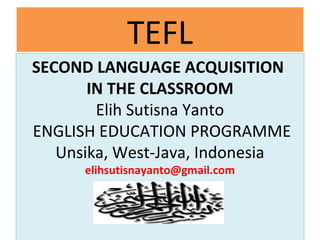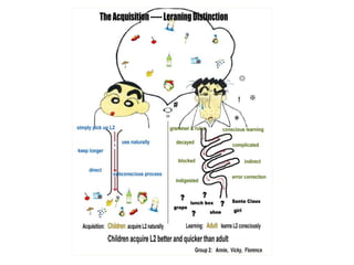 This document discusses theories of second language acquisition, including behaviorism, cognitive theory, and creative construction theory. Behaviorism views language development as habit formation influenced by the first language. Cognitive theory sees acquisition as building knowledge systems that become automated through practice. Creative construction theory proposes that learners internally construct representations of the target language through listening and reading, with speech and writing being outcomes rather than causes of learning.