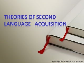 The document presents an overview of theories of second language acquisition (SLA). It discusses domains to consider in an SLA theory, including that SLA involves cognitive variations and is intertwined with culture learning. Several SLA theories are then summarized, including Krashen's Input Hypothesis with its sub-hypotheses, cognitive models focusing on attention and implicit/explicit knowledge, and Long's Interaction Hypothesis emphasizing the role of modified interaction between learners and native speakers. The theories represent innatist, cognitive, and social constructivist perspectives on SLA.