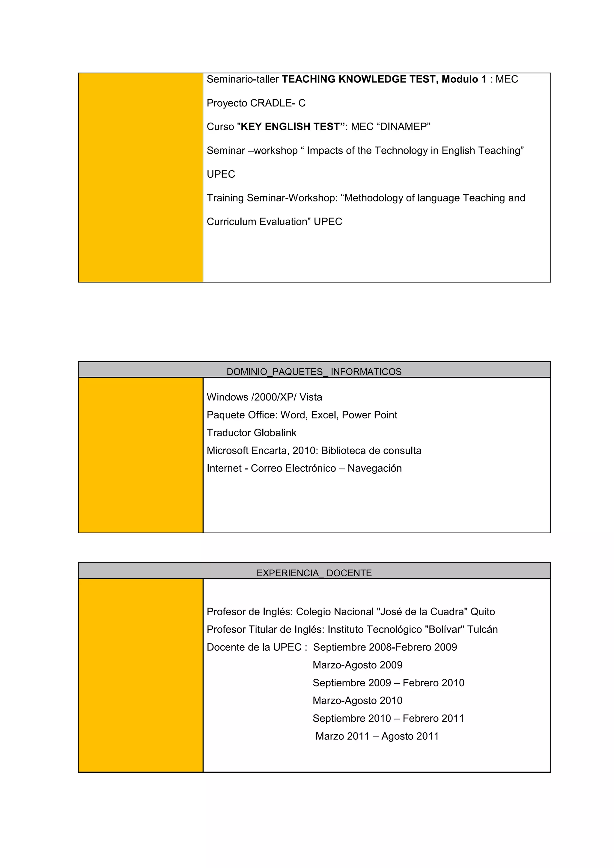 The document provides information on the curriculum vitae of Professor Jairo Castro G. It includes his personal details, education qualifications, computer skills, teaching experience, and the English proficiency module he teaches.
