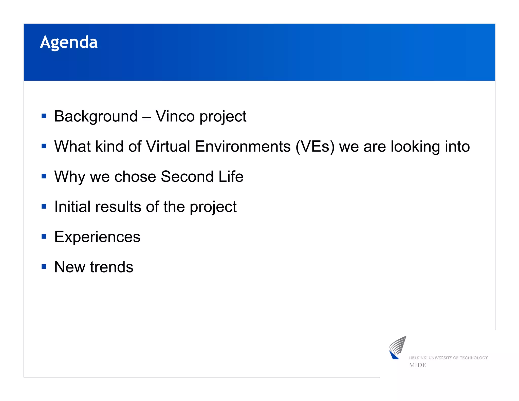 The document presents the Vinco project, which investigates collaboration and communication in global distributed teams within virtual environments, specifically Second Life. It discusses the unique dynamics of these virtual spaces and their applications in business and education, including professional use cases and emerging trends. Initial findings suggest a need for further research on the potential of virtual environments for fostering teamwork, innovation, and educational experiences.