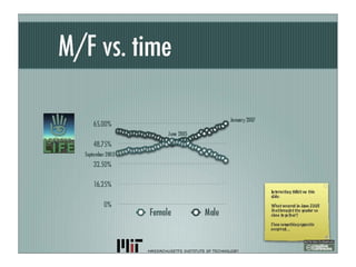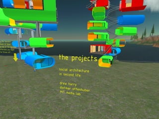 The document outlines a project aimed at helping incoming freshmen at MIT make informed choices about their residence halls through virtual worlds. It discusses the design and implementation of a game-based environment where students can explore and understand the different cultures of residence halls, as well as the legal and administrative considerations involved in utilizing virtual spaces like Second Life. The document also highlights the project's goals, including engagements with academics and alumni to enhance the MIT community's virtual presence.