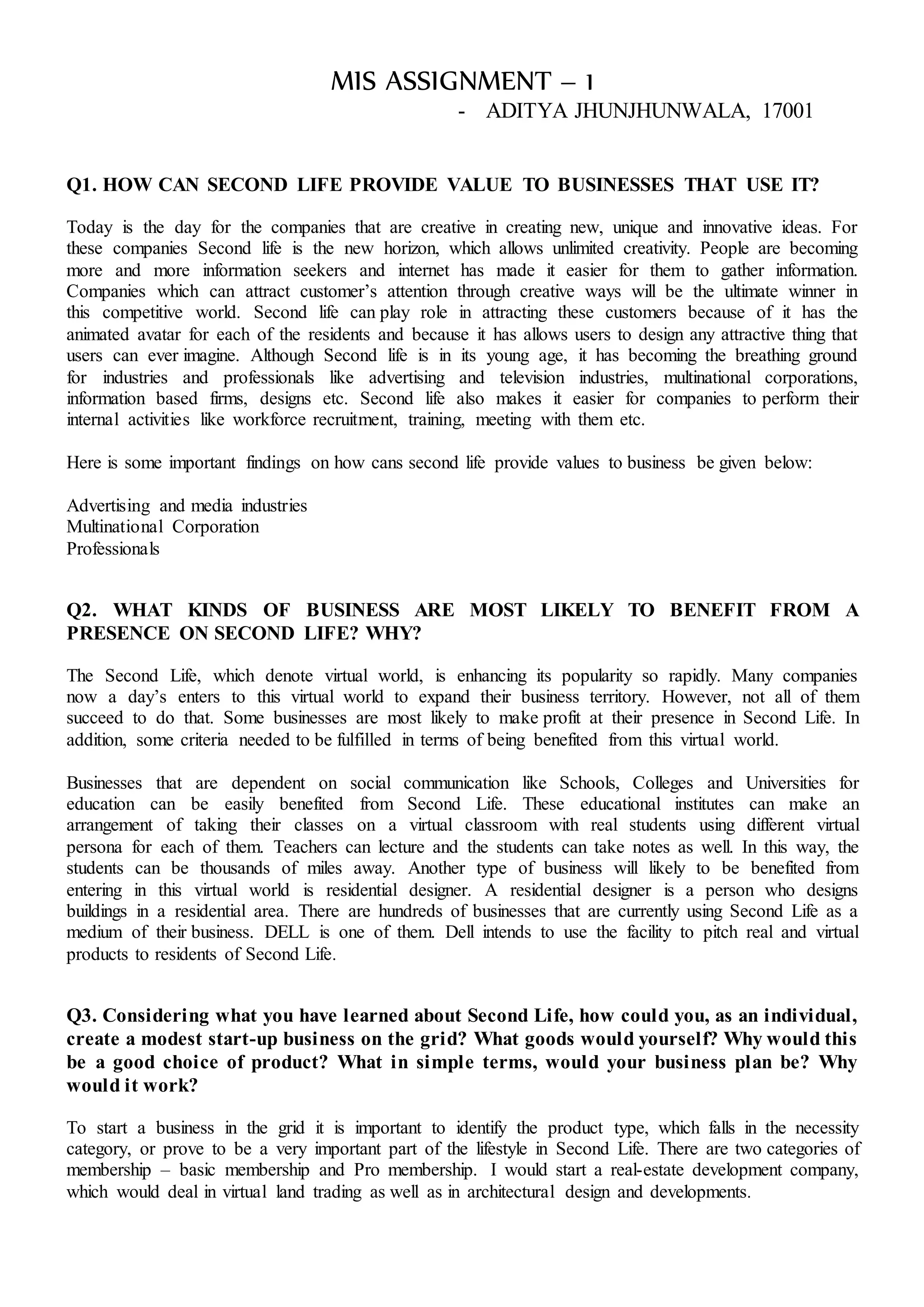 Second Life can provide value to businesses by allowing unlimited creativity and innovative ideas through its animated avatars and ability to design anything imaginable. It is becoming a platform for industries like advertising, television, and large corporations to perform internal activities like recruitment and training. Businesses that rely on social communication, like schools and universities, as well as residential designers, are most likely to benefit from a presence in Second Life. As an individual, a good start-up business would be a real estate development company dealing in virtual land trading and architectural design, taking advantage of Second Life's necessity products and membership options.