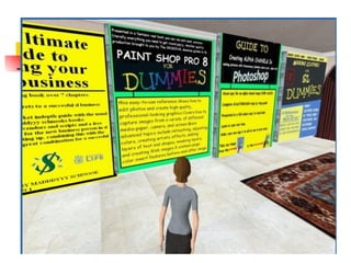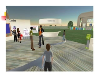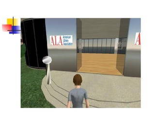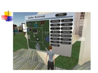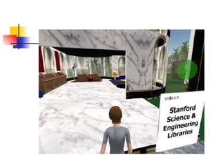 The document details Second Life (SL), a virtual world and MMORPG with over 6.6 million registered users, highlighting its community and business aspects. It discusses the involvement of libraries and librarians within SL, showcasing various virtual libraries, educational opportunities, and social issues. Additionally, it touches on the platform's demographics, economic dynamics, and various fictional simulations for entertainment and learning purposes.