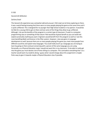This student had a mixed experience exploring Second Life. They felt uncomfortable at times due to the unfiltered nature of the virtual world and don't think it's appropriate for young children. However, they acknowledge potential benefits for subjects like computer programming, engineering, math, science, and language development. As a physical education major, the student wouldn't want to use Second Life in their own classroom since it requires long periods of sitting, which contradicts their goals of keeping students active. They suggest finding a way to adapt the assignment to be more relevant for a physical education class.