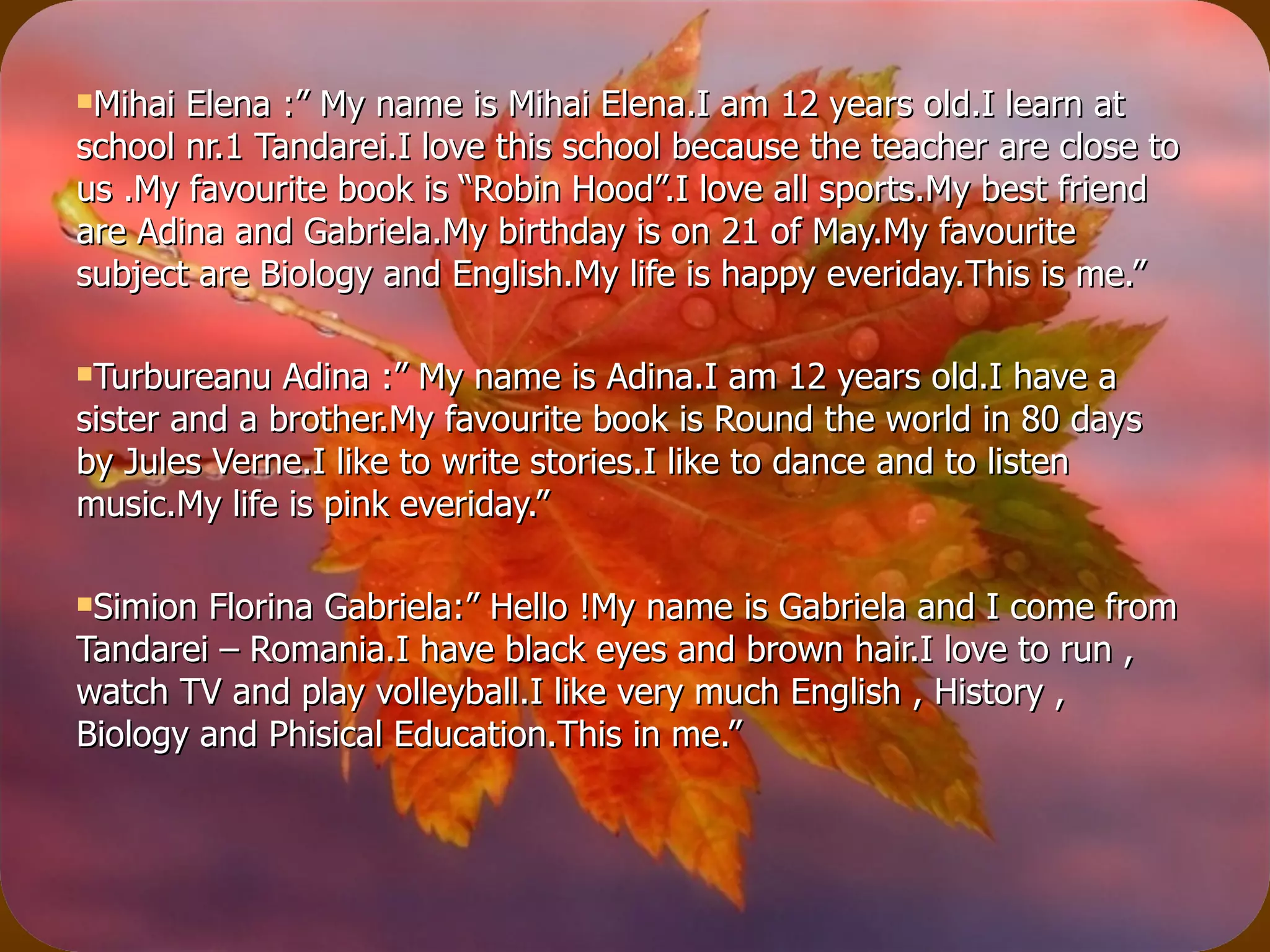 The document contains introductions from several students in Romania describing themselves, their school, friends, and interests. Key details include: