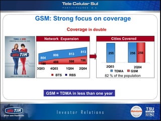(1) Tele Celular Sul Participações S.A. (TIM Sul) reported strong 2Q04 results with its GSM network. (2) The company rapidly expanded GSM coverage to 82% of the population within 10 months through high site-sharing of 97%. (3) TIM Sul achieved record subscriber growth in 2Q04 with net additions up 284% and GSM lines now representing 22.2% of the total subscriber base.