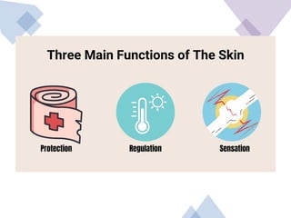The integumentary system consists of the skin, hair, and nails, serving critical functions such as protecting internal organs, regulating temperature, and sensing environmental changes. The skin, the body's largest organ, is composed of multiple layers: the epidermis, dermis, and hypodermis, each playing vital roles in protection, moisture retention, and energy storage. Functions of the integumentary system include providing a barrier against pathogens, preventing dehydration, and facilitating temperature regulation.