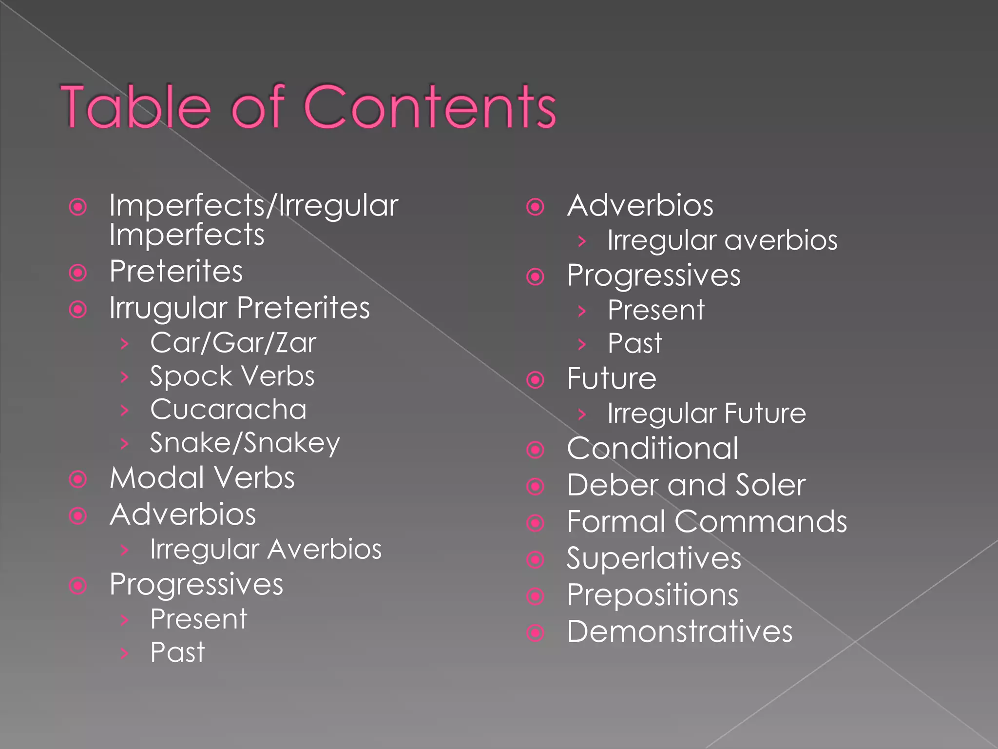 - Verb tenses such as imperfect, preterite, future, conditional, modal verbs, progressives.