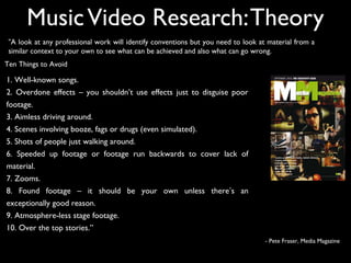 The document provides tips for students creating music videos, album covers, and magazine advertisements from a professional perspective. For music videos, it advises avoiding well-known songs, overused effects, and uninteresting footage. It also recommends considering budget limitations. For album covers, it discusses attracting audiences through eye-catching and genre-fitting designs that convey the musicians and music. For magazine ads, it emphasizes photograph quality, theme relevance, and understanding the target audience. The tips are meant to help students think professionally while acknowledging their resource constraints.