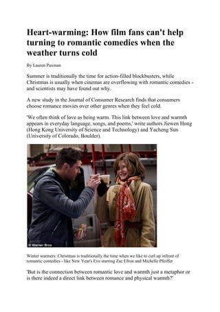 3) An analysis of actual movie rental data also showed people were more likely to rent romance movies when outside temperatures were lower, indicating this effect occurs in real world settings.
