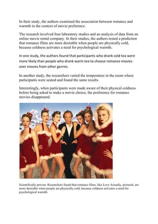 1) A study found that when people feel physically cold, they prefer and choose romantic comedy movies over other genres, as physical coldness activates a need for psychological warmth.