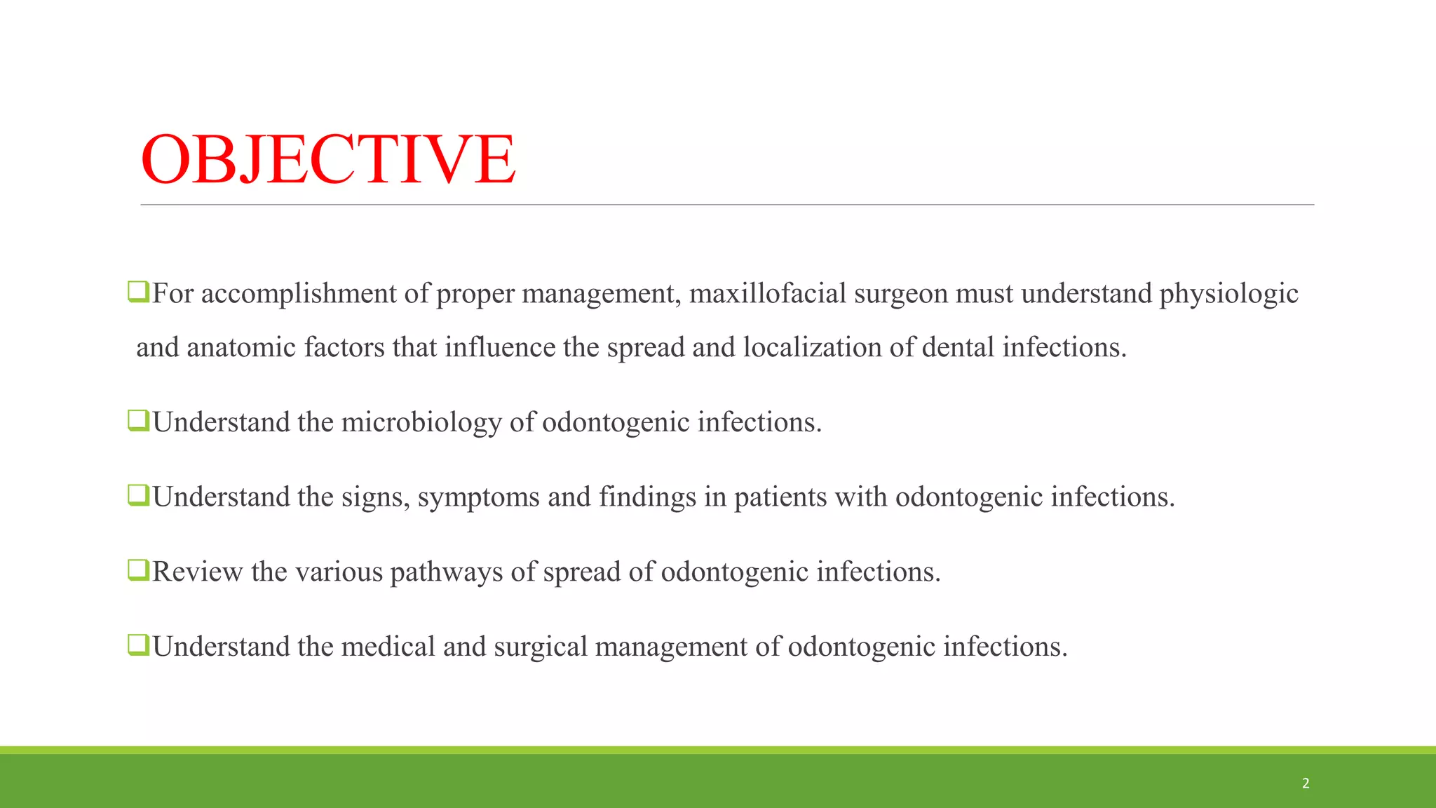 2. Odontogenic infections most commonly involve aerobic bacteria that spread from the site of infection through the path of least resistance in fascial planes.