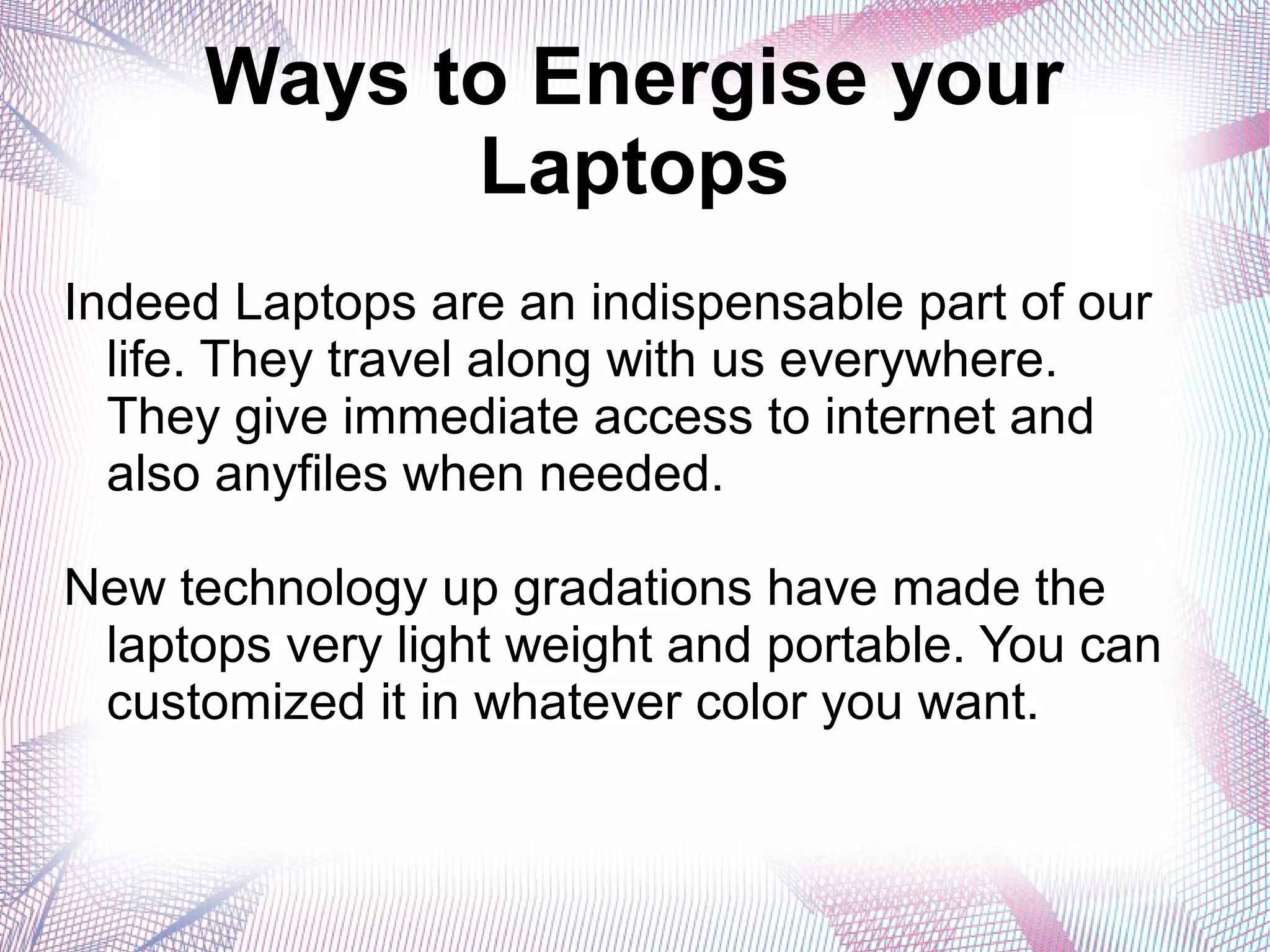 The document outlines essential tips to maintain and energize laptops, emphasizing hardware care, software updates, and battery preservation. Key recommendations include keeping the laptop clean, preventing overheating, using protective cases, and managing software clutter. Following these practices can extend the laptop's lifespan and improve performance.