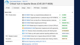 The document outlines Atlassian's approach to security incident management, emphasizing their security team's processes and communication strategies. It details the incident handling phases from preparation to post-incident review regarding a vulnerability in the Apache Struts framework. Key activities include detecting, analyzing, containing, and recovering from incidents while ensuring trust and transparency throughout the process.