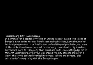 Luxembourg City is a small but intriguing capital with modern art, multilingual residents, and views of surrounding forests and valleys from its hilltop location. Though known for its banks, there is more to explore culturally.
