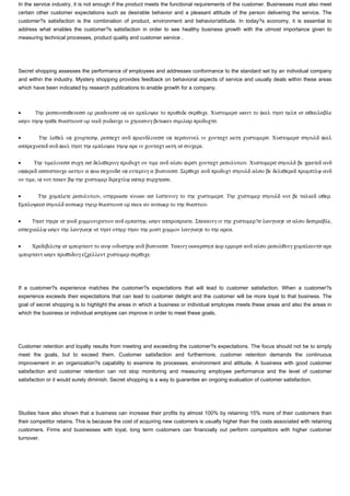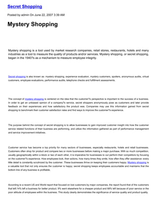Mystery shopping or secret shopping involves anonymously evaluating customer service by posing as customers. Secret shoppers visit stores, restaurants, hotels and provide feedback on their experiences. Their reports help businesses benchmark customer satisfaction, identify areas for improvement, and ensure employees provide quality service. Secret shopping evaluates factors like employee courtesy, timeliness, issue resolution and communication which research shows are important for customer retention and business growth. Businesses use secret shopping to objectively measure the customer experience and ensure customer expectations are being met.
