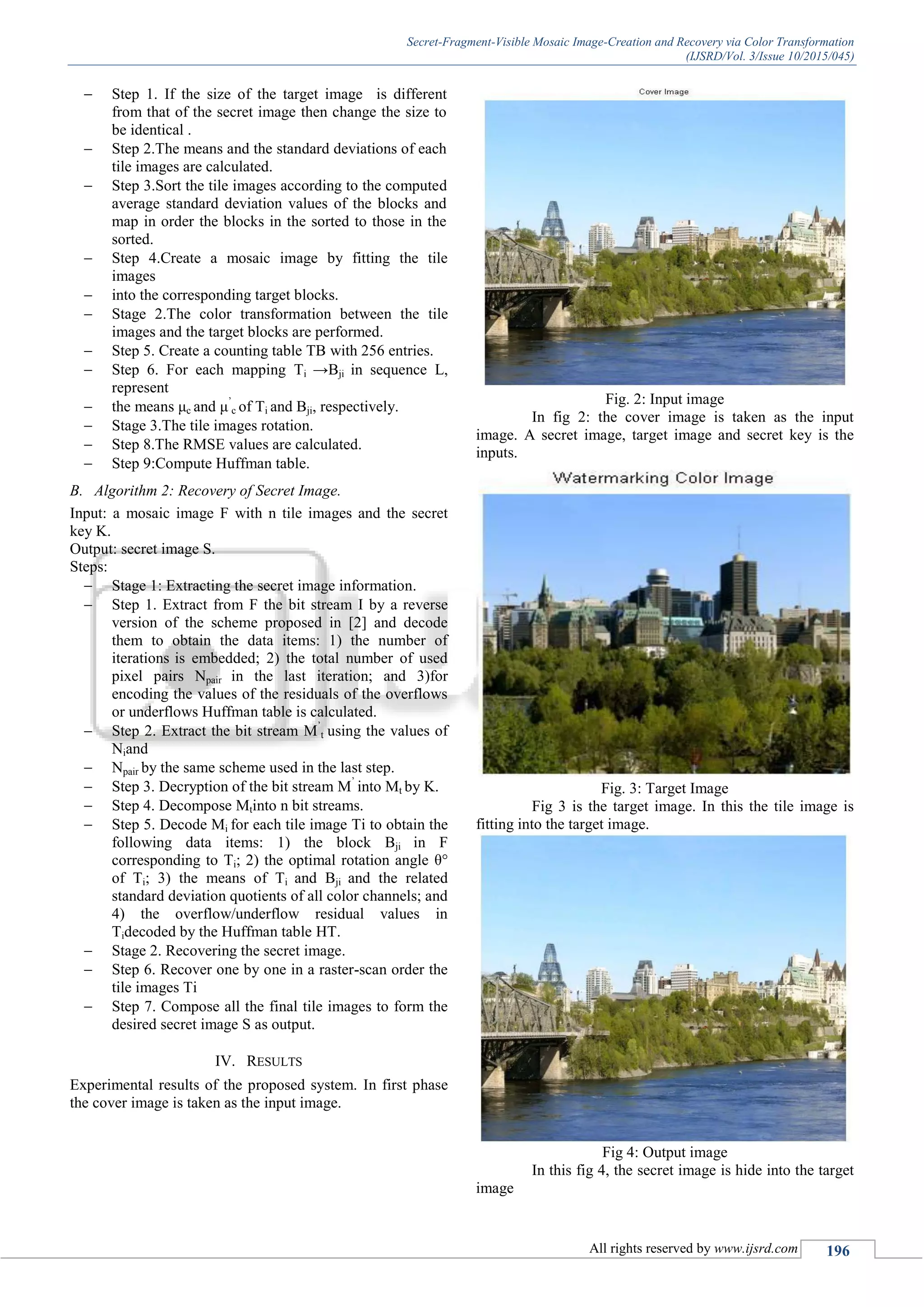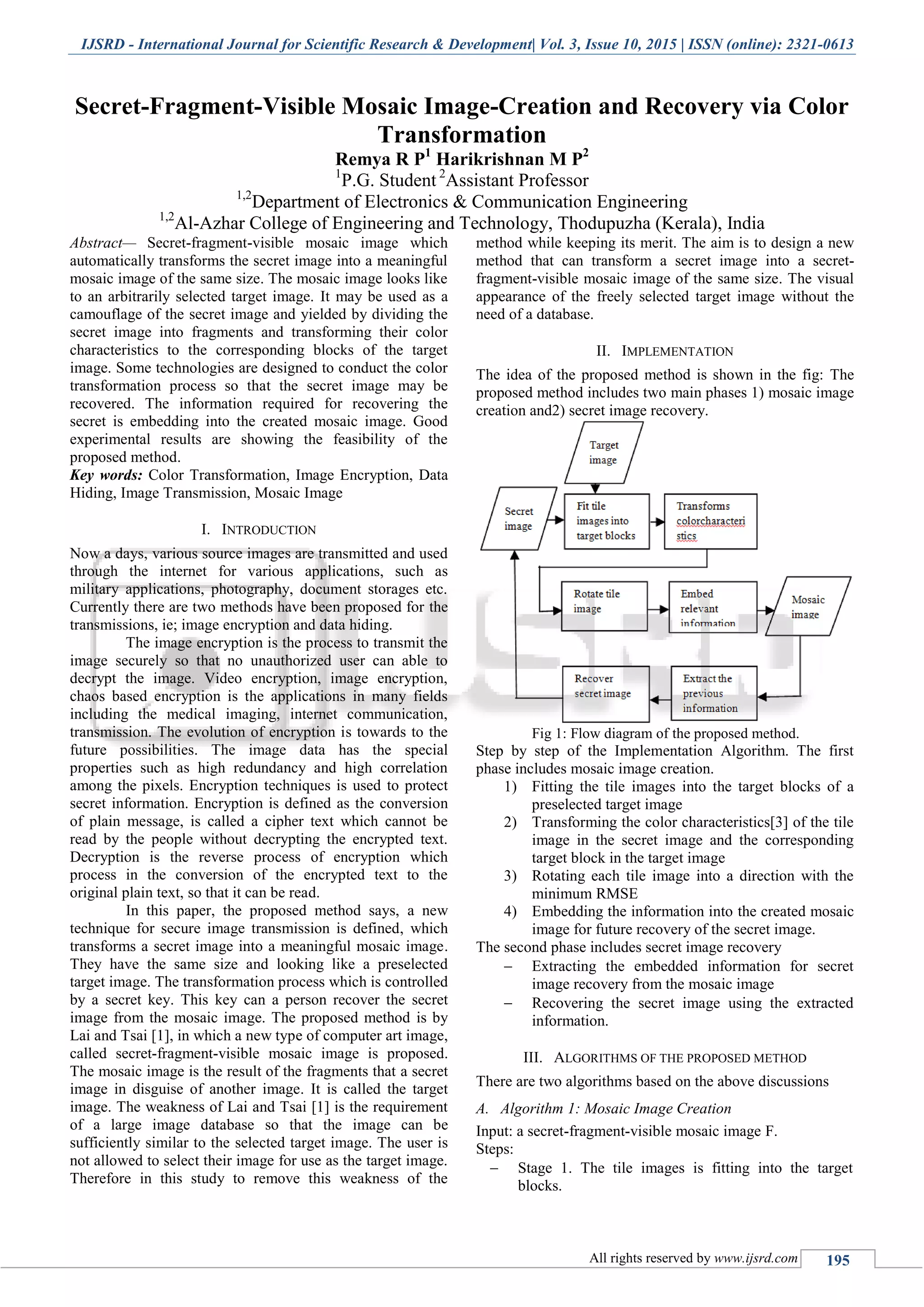 The document presents a method for creating secret-fragment-visible mosaic images, which hide a secret image within a mosaic that resembles a target image. The proposed method enables the transformation of the secret image while ensuring the same size and allows for its recovery using embedded information. Experimental results demonstrate the method's feasibility, emphasizing its potential applications in secure image transmission.