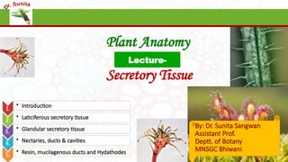 The lecture covers plant secretory tissues, highlighting laticiferous and glandular tissues, which produce various secretions such as latex and enzymes. Laticiferous tissues consist of ducts for latex production, which is important for economic purposes, while glandular tissues have specialized cells that secrete substances like oils and digestive enzymes. The document explains the structures, types, and functions of these secretory tissues, including their roles in food conduction, storage, and regulation of water balance in plants.