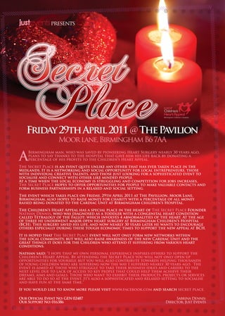 The Secret Place is a networking and social event taking place on April 29th in Birmingham where people can meet new connections, dance, and have fun. Tickets are £12.50 with early bird prices of £7.50 available before April 15th. A percentage of funds raised will be donated to the Birmingham Children's Hospital Heart Appeal. The event founder was saved by heart surgery at the hospital as a child and wants to give back. The goal is to help people make business connections and support the hospital's cardiac unit.