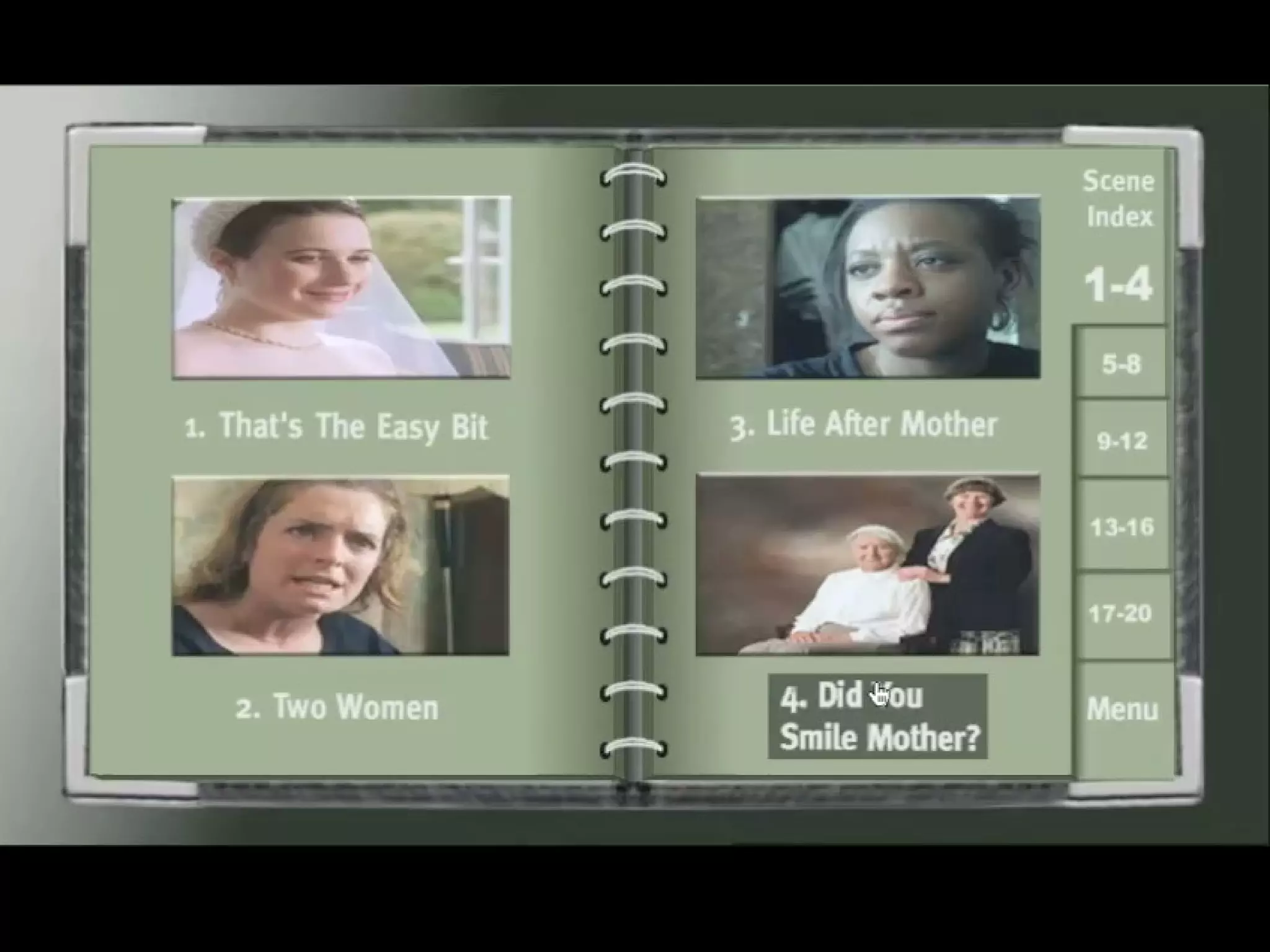 #2 The beginning of this scene establishes the setting. From just this image, we establish that its going to be set in a photography shop, as the shop is in the centre of the shot. The black cab also establishes that its set in London. Its shot in natural light. Like all the other shots we will see in this presentation, the film is shot from the point of view of a photography camera. We know this because of the people posing in front of it, and they’re looking directly in the eye of the camera. The costumes reflect the characters. The father is in a suit, the son is wearing his regular clothes, wife is wearing a nice white dress, and the grandmother is wearing an old fashioned purple gown. Everyone looks like they’ve dressed for a photo, (besides the son) The backdrop is a standard photography backdrop. The lighting consists of a key light on the subjects, and filler lights to soften the shadows against the backdrop. Everything in this photo is made to look like a photographers studio.