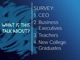 This document discusses the skills needed for success in the 21st century workplace according to interviews with business executives. It identifies 7 key secrets: